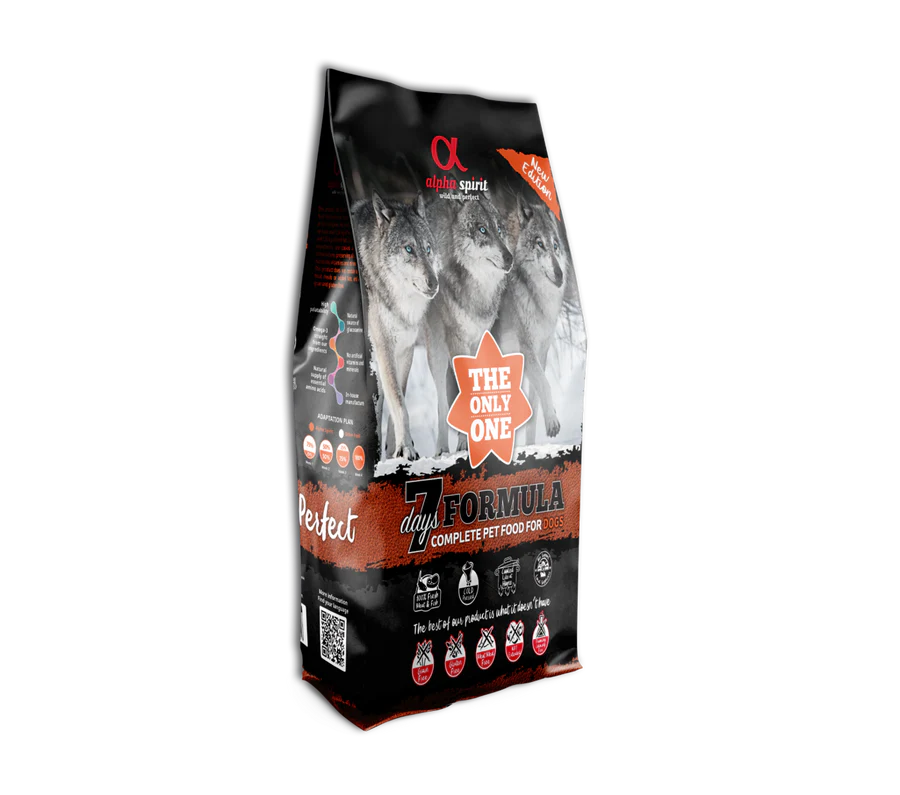 Alpha Spirit Dog 7 Days es un alimento para perros libre de cereales, libre de gluten y libre de harinas cárnicas, de fabricación propia, empleando ingredientes naturales y frescos de categoría alimentaria humana.